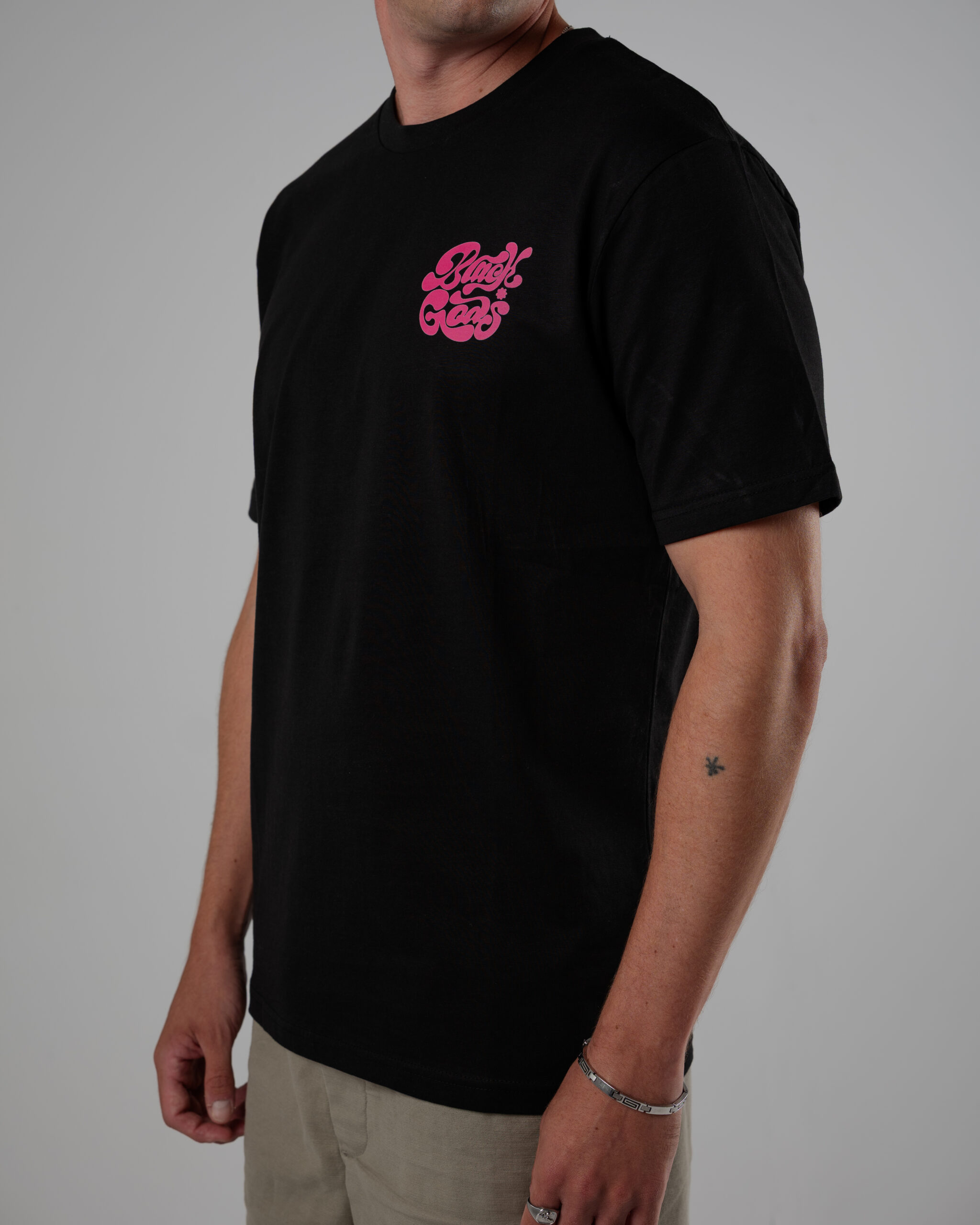 Colores: negro en el interior de tejido principal en el cuello y hombros caídos. logo frontal en rosa