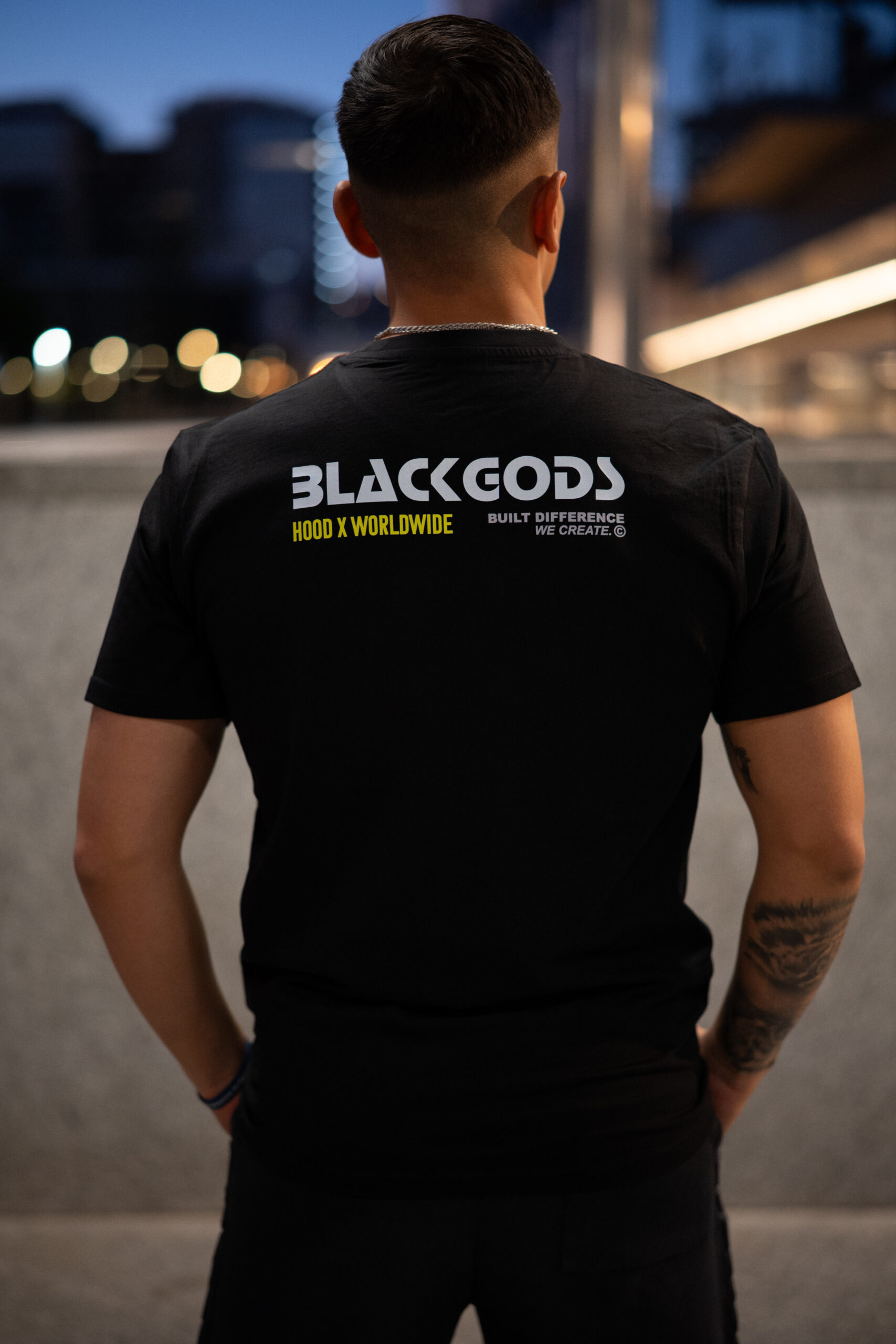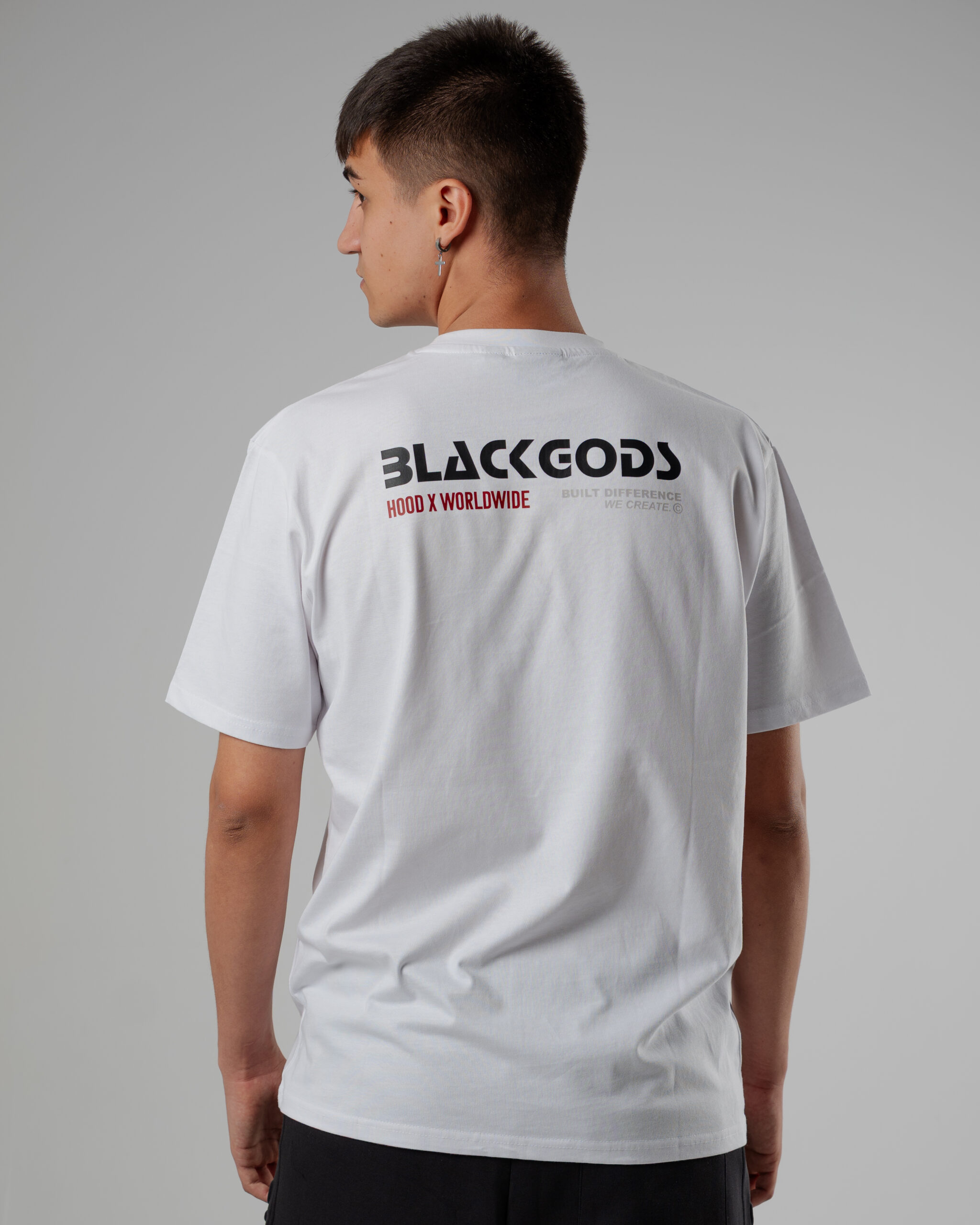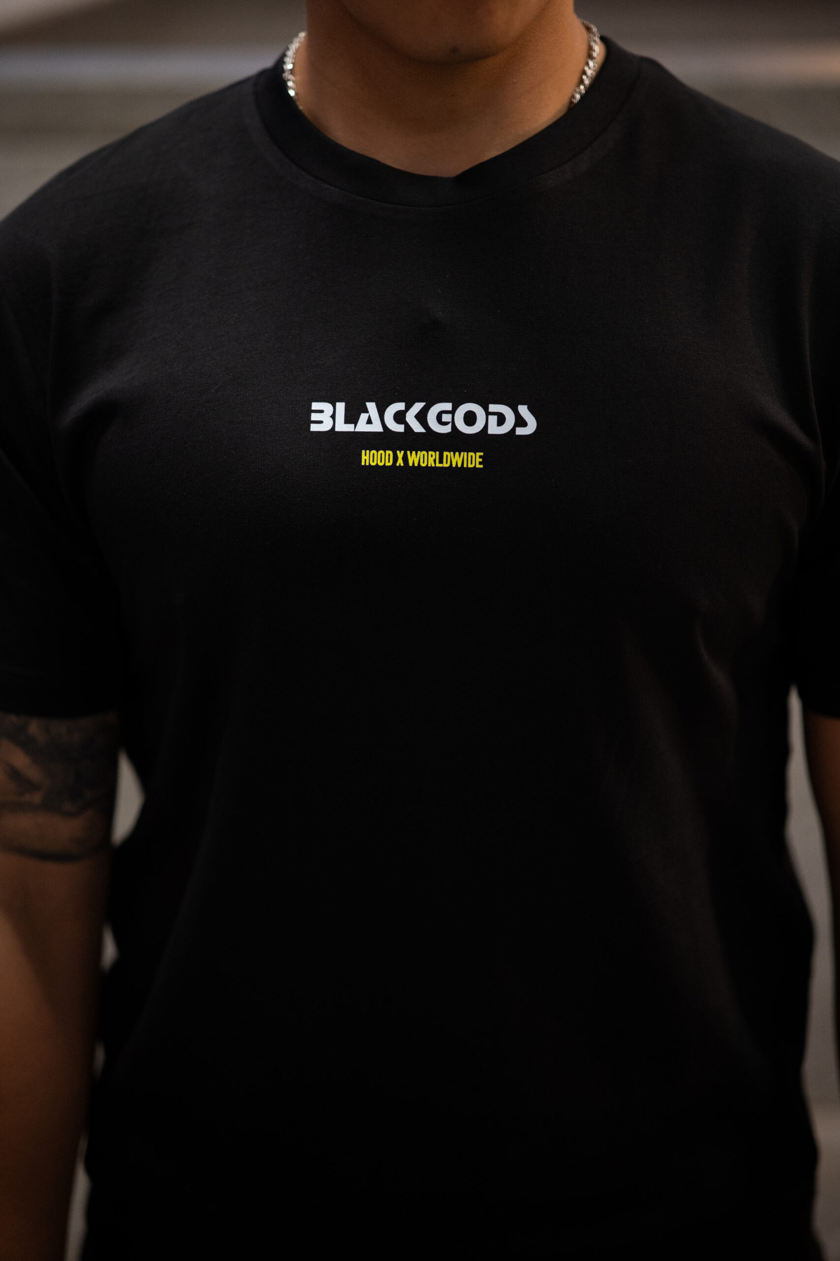 Colores: negro y blanco interior de tejido principal en el cuello y hombros caídos. logo frontal en blanco, amarillo en estampado trasero y logo frontal en blanco, rojizo en estampado trasero y logo frontal en negro, respectivamente