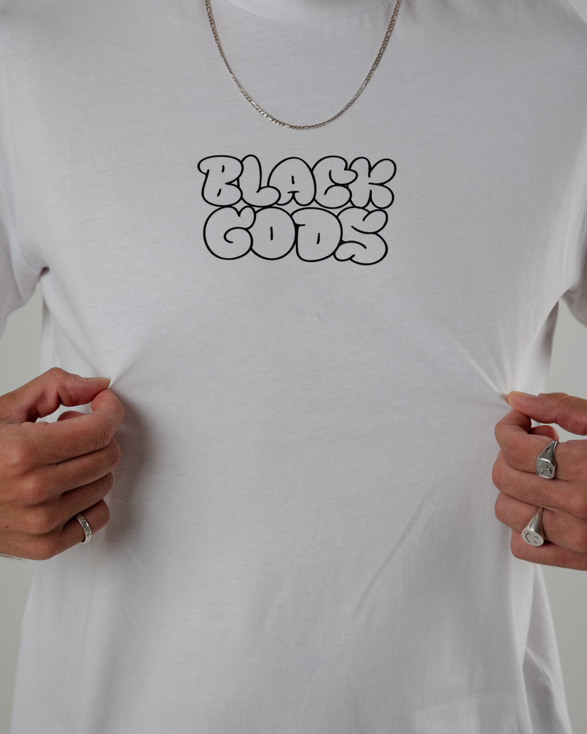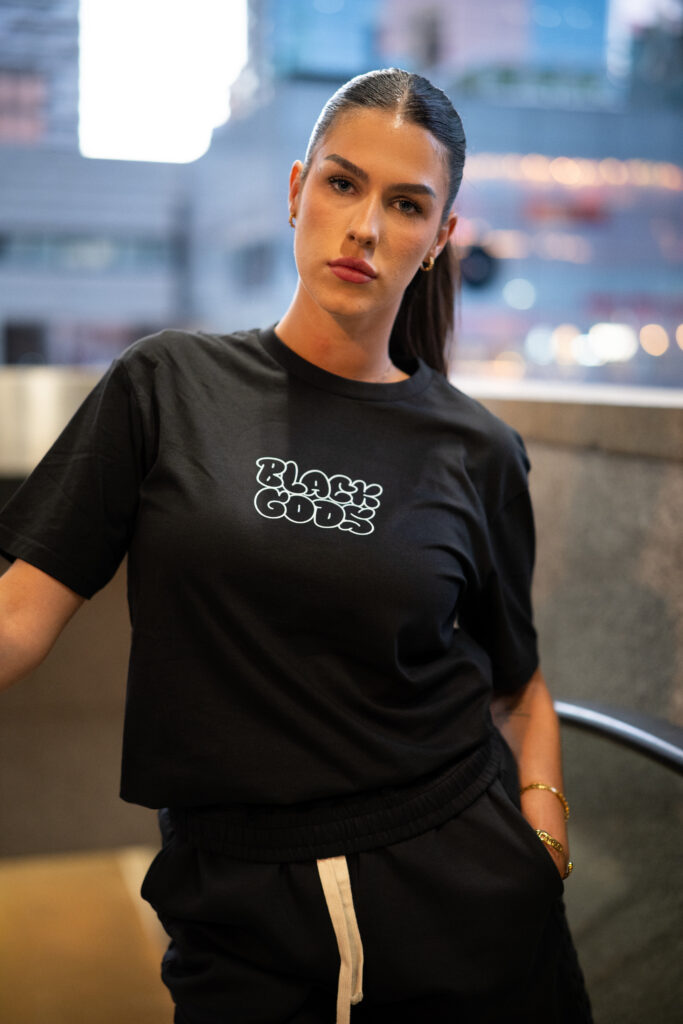 Colores: negro en el interior de tejido principal en el cuello y hombros caídos. logo frontal en blanco; blanco en el interior de tejido principal en el cuello y hombros caídos, logo principal en negro respectivamente.