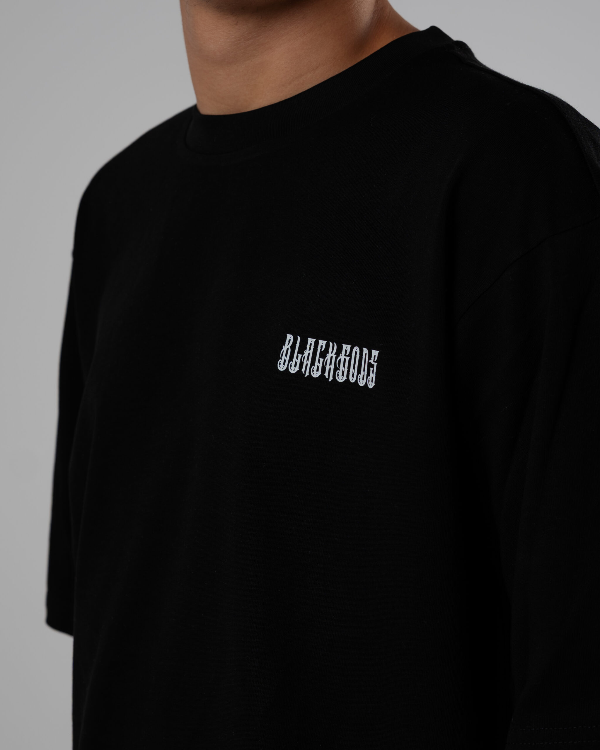 Colores: negro interior de tejido principal en el cuello y hombros caídos. logo frontal en blanco