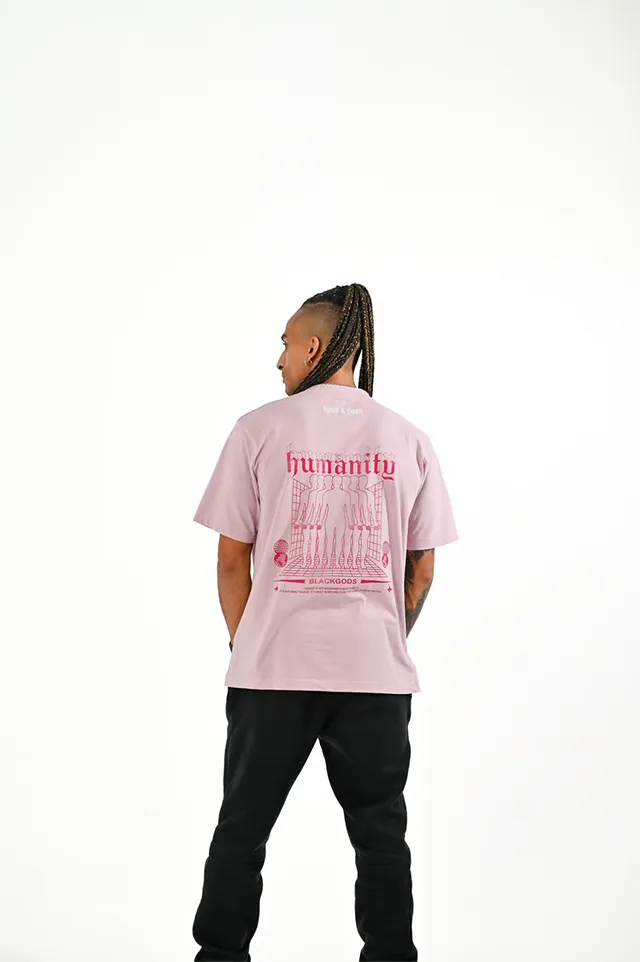 Colores: rosa palo oscuro, tejido principal en el cuello y hombros caídos. bordado «hood x hood» blanco