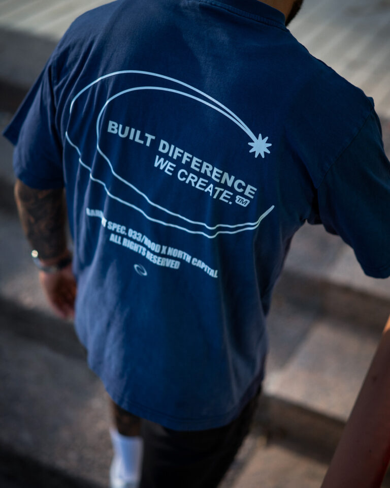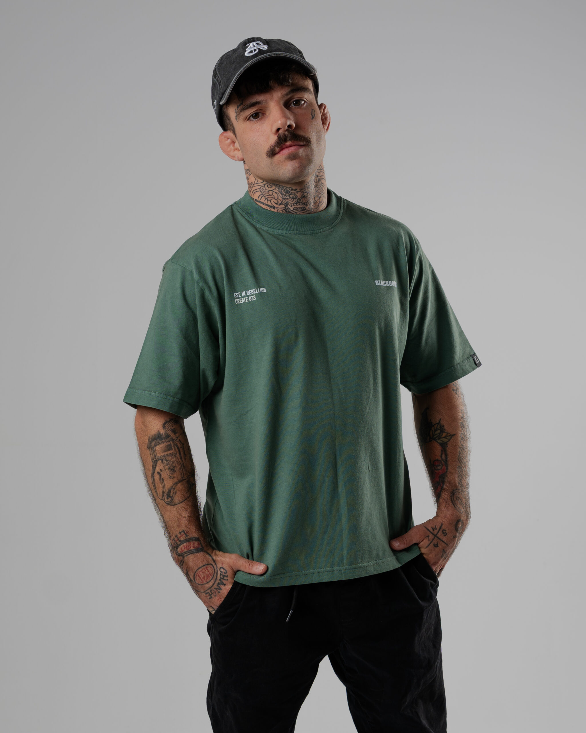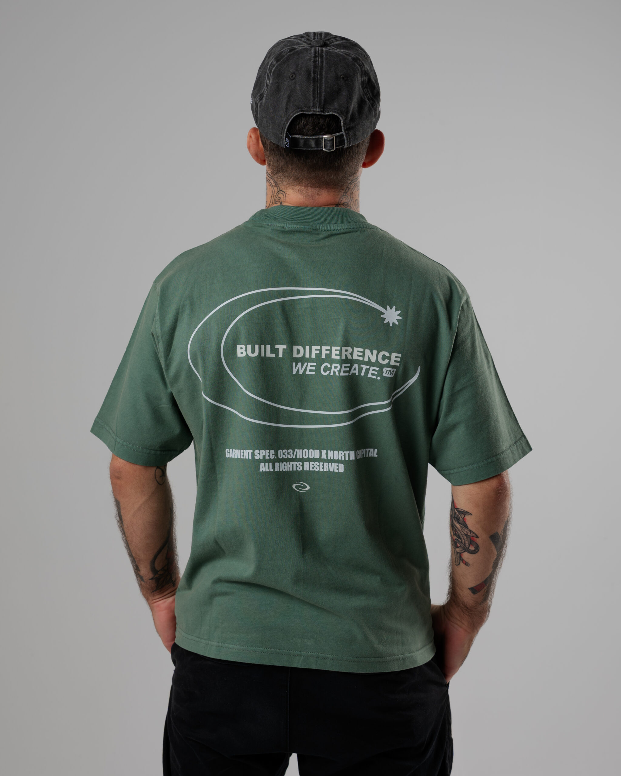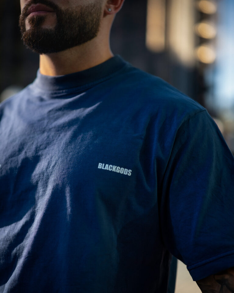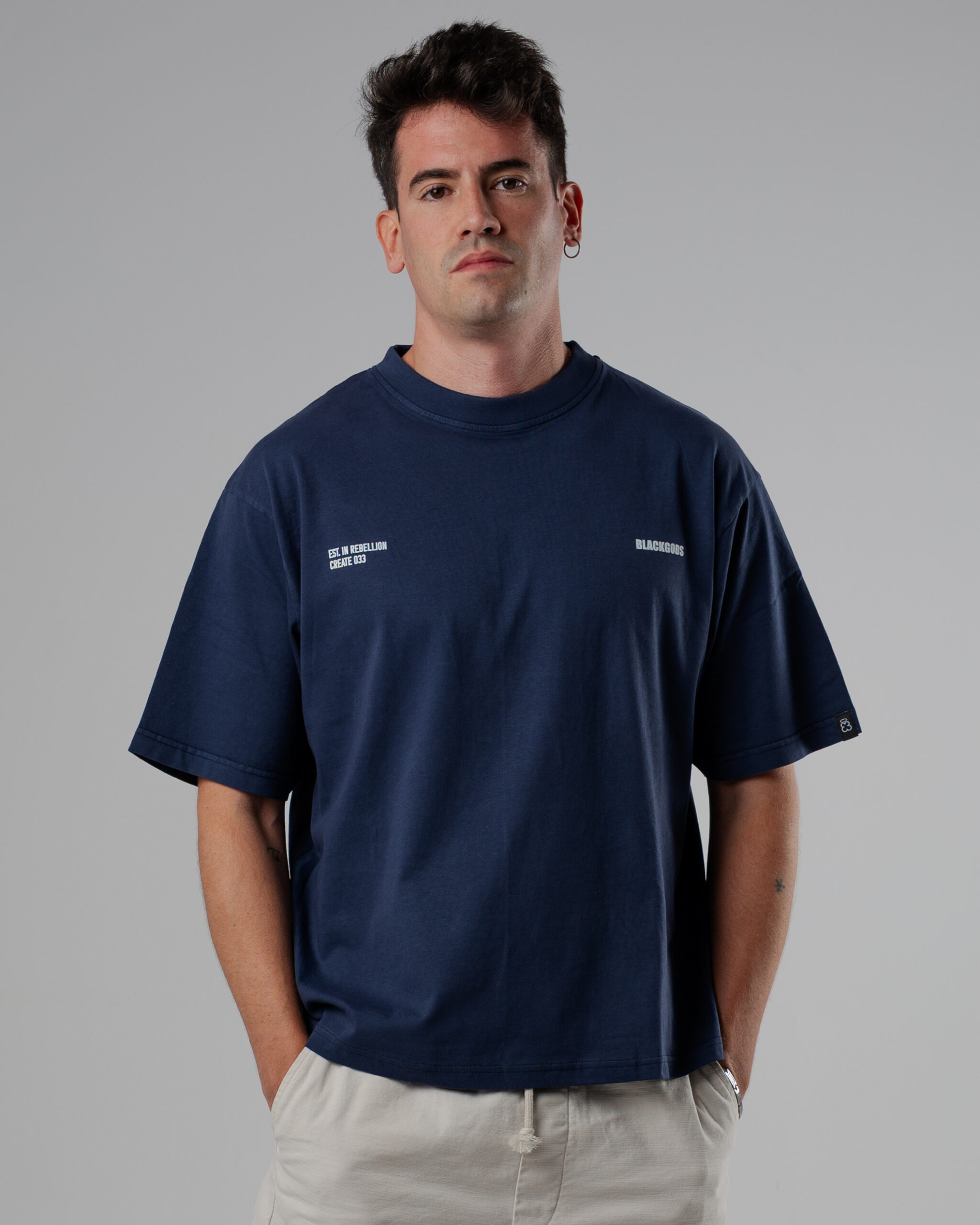 Colores: azul oscuro interior de tejido principal en el cuello y hombros caídos. logo frontal y estampado trasero en blanco, verde oliva interior de tejido principal en el cuello y hombros caídos. logo frontal y estampado trasero en blanco