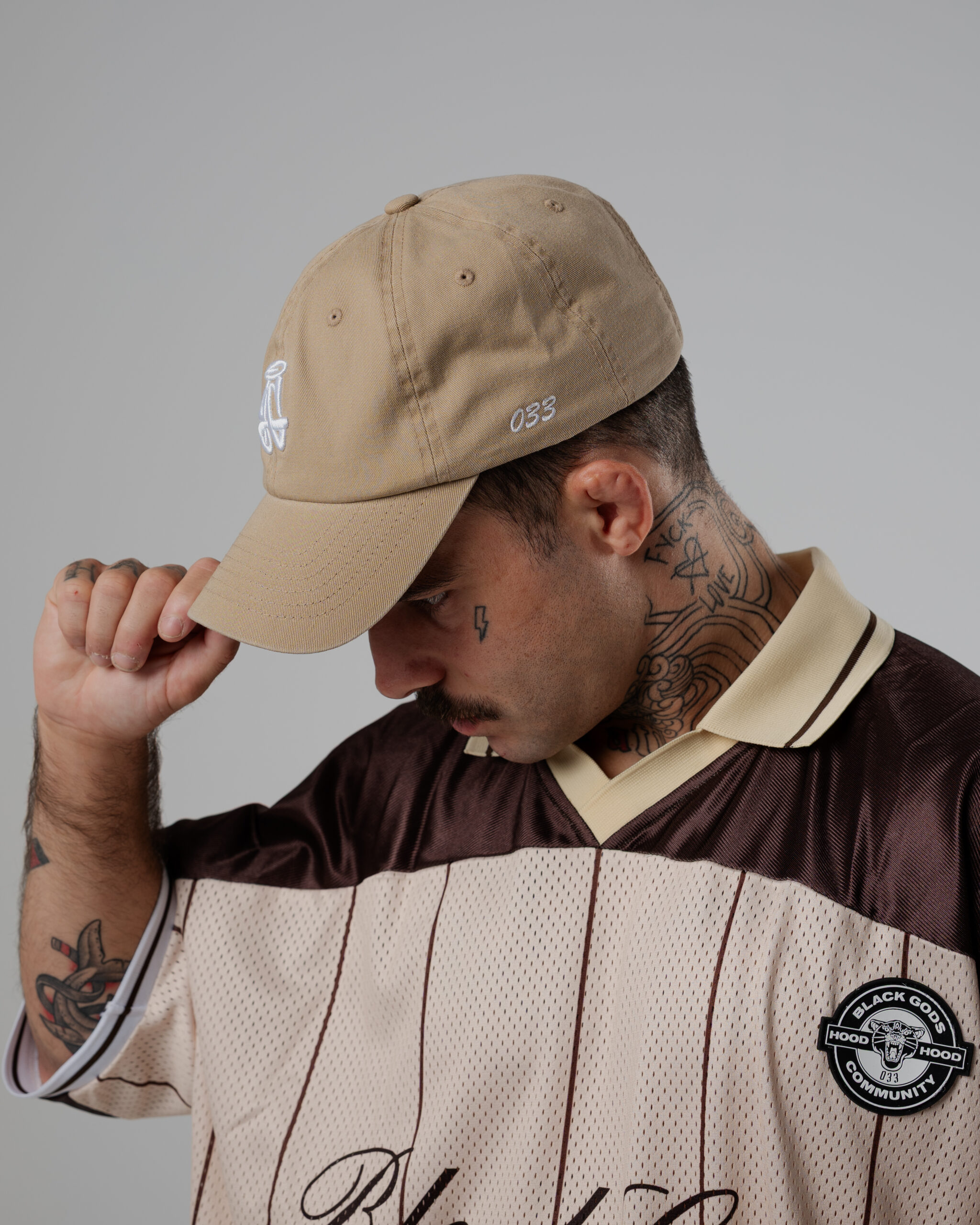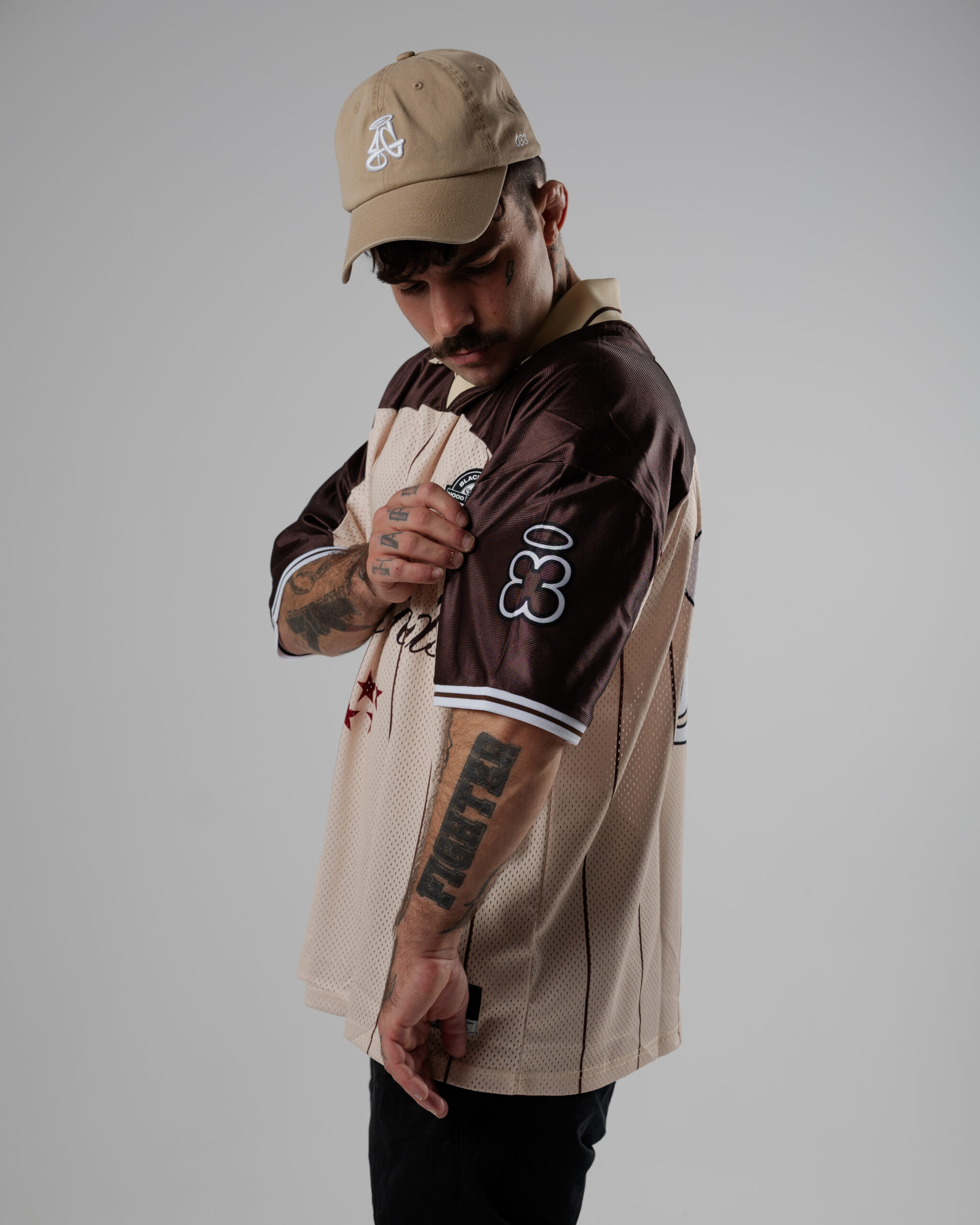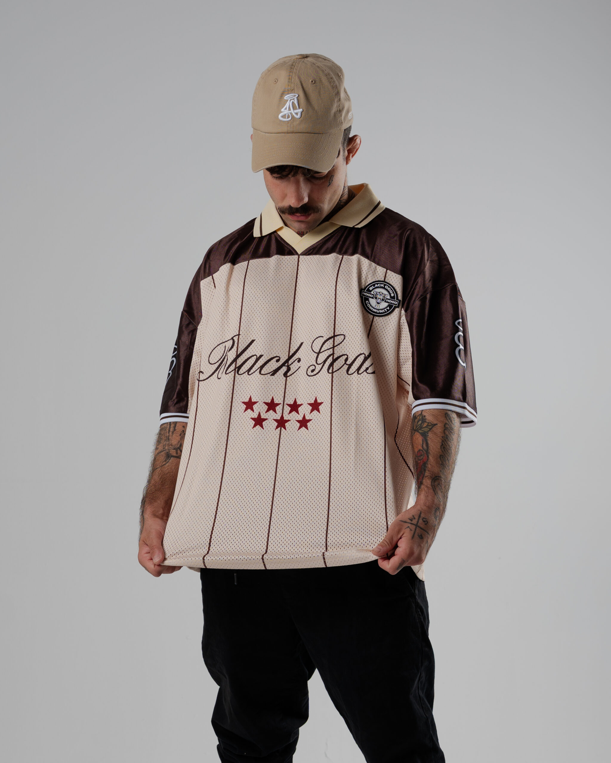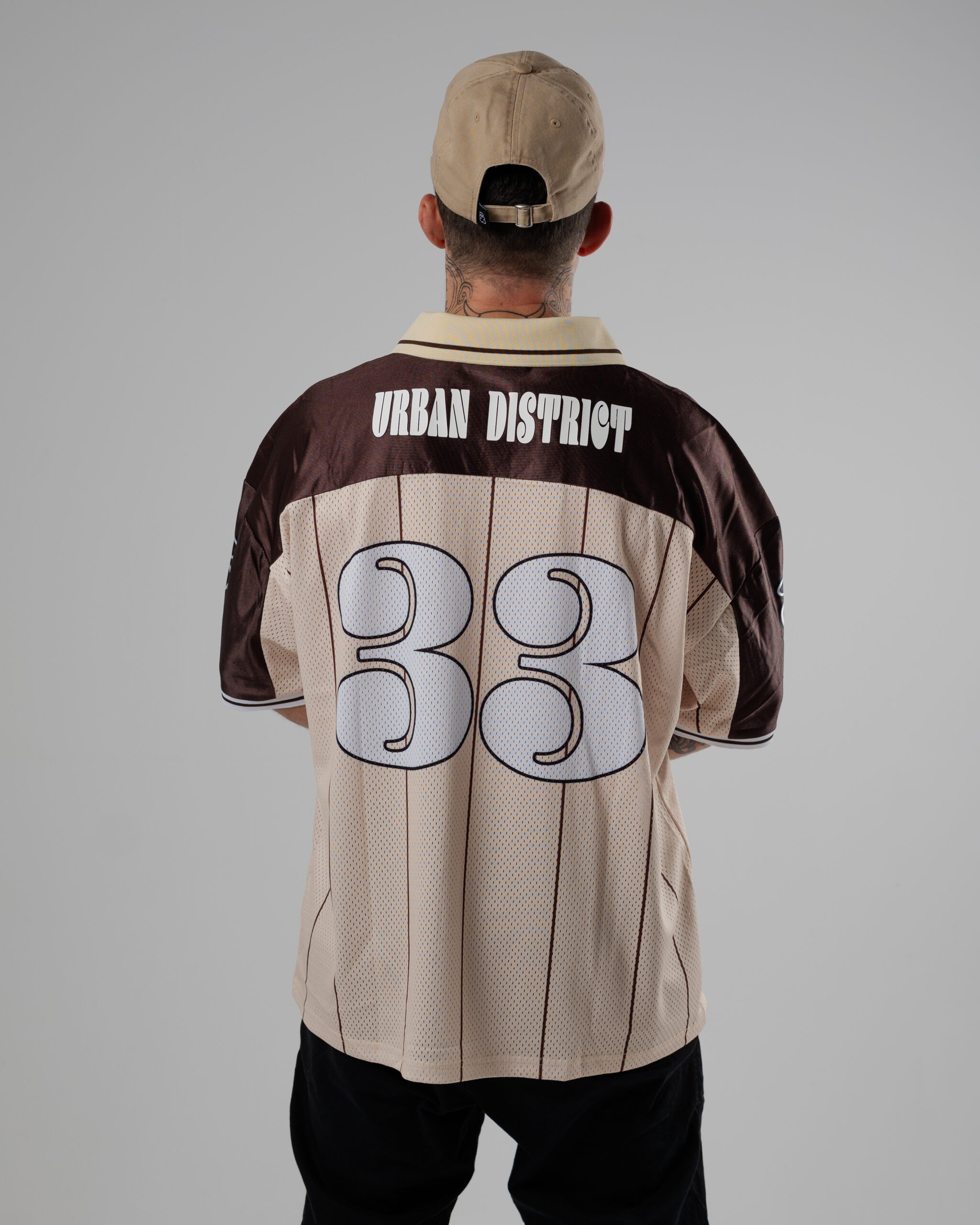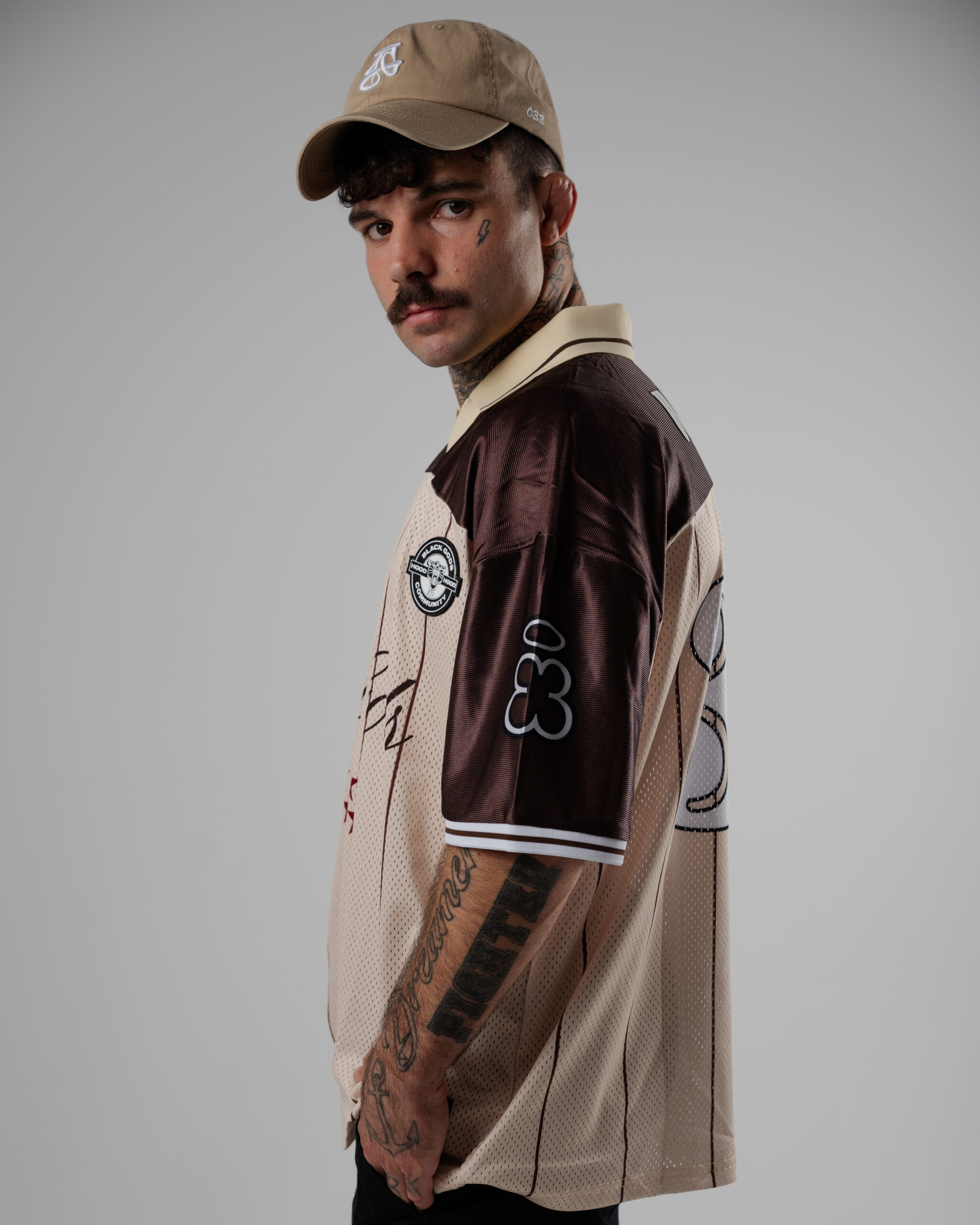 Colores: retro camel y dark rum. logo frontal en negro y blanco